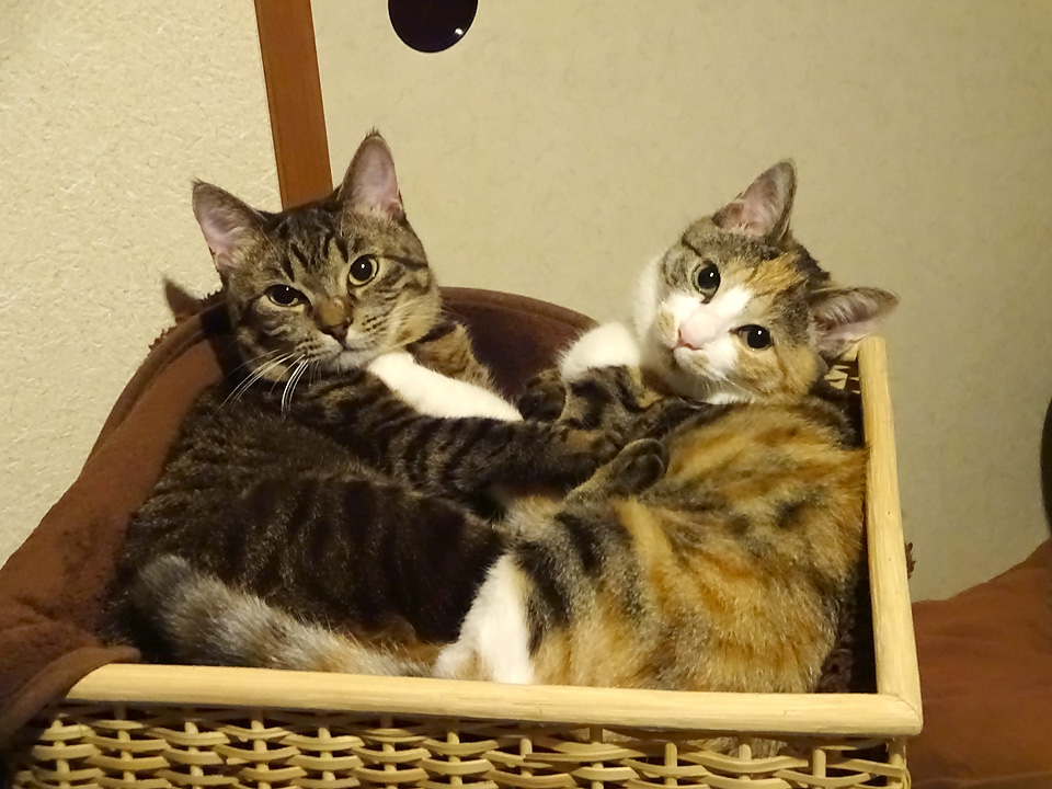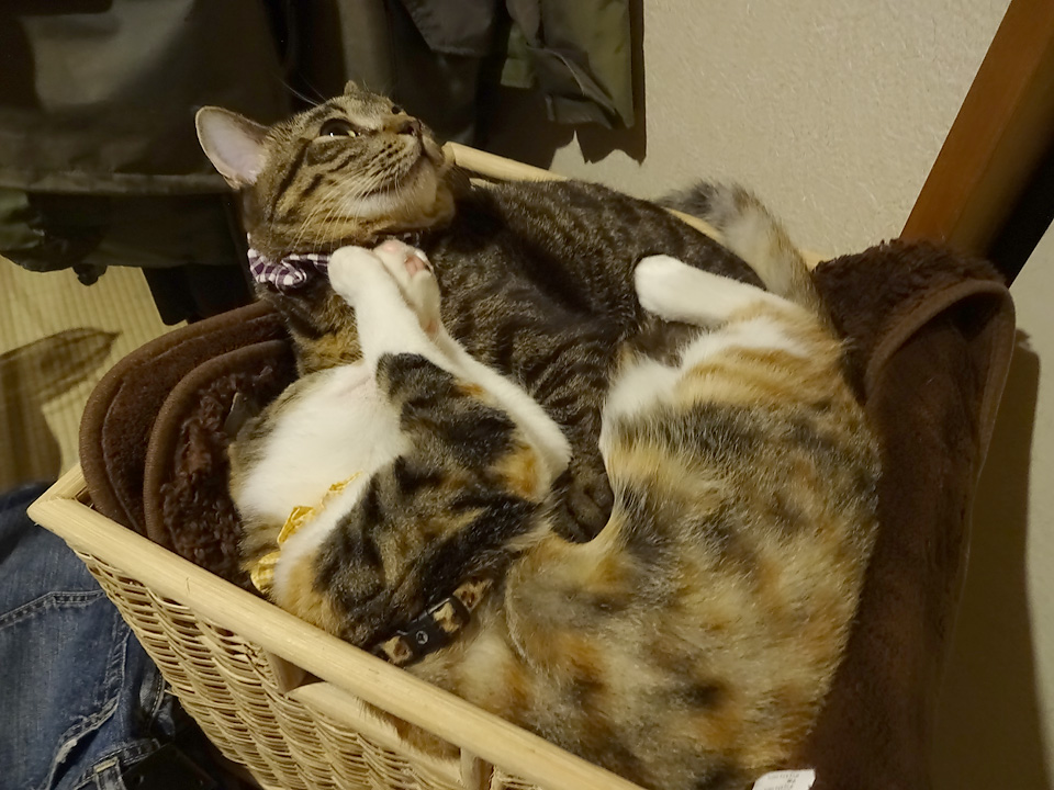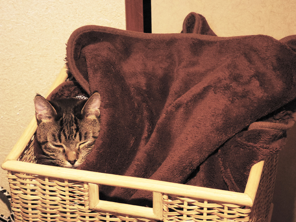 シマの寝ているこれは、飼い主のタオルケットが入っている籠なのです。